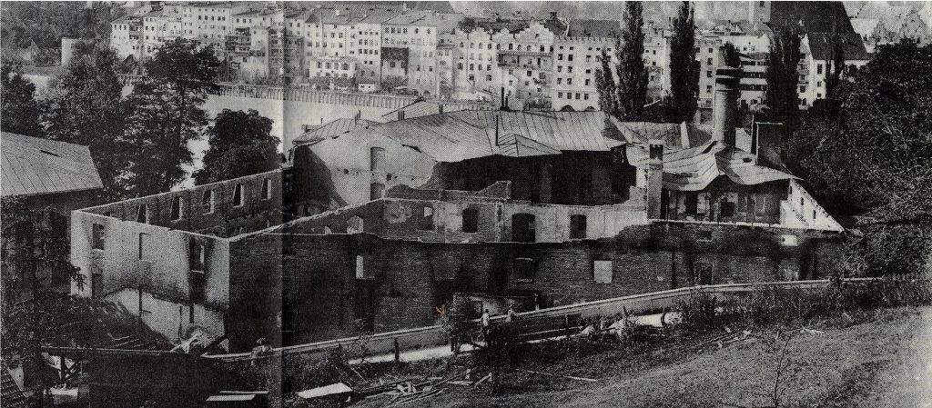 „Großfeuer in Wasserburg Am letzten Freitag, Abends gegen 9 Uhr, wurde die hießige Einwohnerschaft abermals in Aufregung und Schrecken versetzt. … auf dem rechten Innufer konnte man eine fast senkrecht emporsteigende Feuer- und Rauchsäule wahrnehmen, … In dem großen, weit ausgedehnten Stadel des Gastwirths Herrn Josef Gimpl (‚zum Bräuwinkl‘) war auf ganz unerklärliche Weise plötzlich Feuer ausgebrochen, welches binnen kurzer Zeit alle Theile des Gebäudes ergriff und dasselbe, … binnen kurzer Zeit vollständig einäscherte. …. Brandstiftung ist in vorliegendem Falle ganz zweifellos. … Beim Bräuer Stechel wurde gestern Nacht ein wiederholter Brandbrief gelegt.“