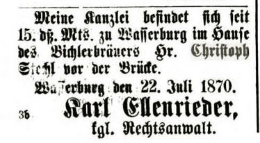 Weißbierbrauerei Ignatz Friedlhuber – 1888, 1. 06. (WA): Alois Eberl kauft Haus Nr. 196, richtet Wirtschaft und Brauerei ein. (Quelle: WA Nr. 47 von 1888). Haus Nr. 196 war vorher Branntweiner Stecher und ist heute das Innkaufhaus. – 1890, 27. 08. (WA): Lorenz Eichner kauft Kaffeeschänke und Weißbierbrauerei von Eberl. (Quelle: WA Nr. 69 von 1890) – 1890, 22. 10. (WA): Joh. Nep. Grenzner kauft Weißbierbrauerei des Herrn Eichner. (Quelle: WA Nr. 85 von 1890) – 1891, 07. 02. (WA): genannt wird eine „Grenzner’sche Weißbierbrauerei“ – 1891, 02. 05. (WA): Ignatz Friedlhuber kauft Weißbierbrauerei in Wasserburg. (Quelle: WA Nr. 36 von 1891) – 1899, 16. 07. Ignatz Friedlhuber führt seine Weißbierbrauerei und Limonadenfabrik wieder selbst. (Quelle: WA Nr. 84 von 1899) – 1922, 11. 03. (WA): Weißbierbrauerei Friedlhuber an Herrn Karl Puchta von Wald an der Alz verkauft. (Quelle: WA Nr. 59 von 1922)