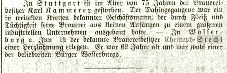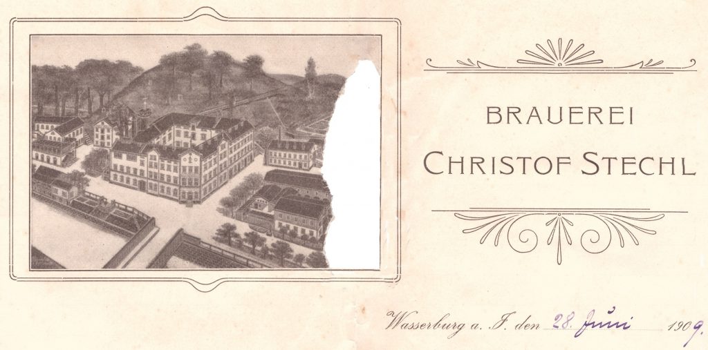 So entwickelte sich die Stechl’sche Brauerei und Gaststätte in dem Jahrzehnt vor dem ersten Weltkrieg prächtig. Die Brauereigaststätte erfreute sich großer Beliebtheit und beherbergte zahlreiche Stammtische. Am Sonntag kamen die Bauern aus der näheren Umgebung mit ihren Kutschen nach Wasserburg und kehrten beim Stechlbräu ein. Im Jahr 1913 verstarb Christoph Stechl (III). Sein Sohn Christof Stechl (IV) übernimmt die Brauerei. Hier ein kurzer Nachruf aus dem Bayrischen Brauer Journal von 1913.